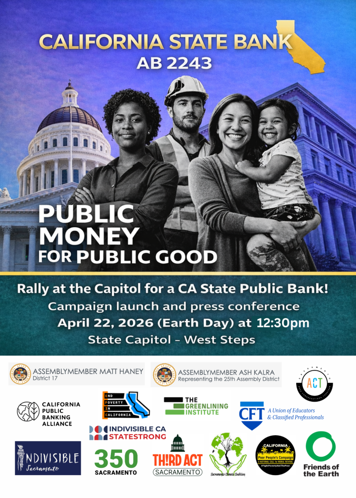 Confirmed orgs attending, including co-sponsors: California Public Banking Alliance (CPBA), End Poverty in California (EPIC), The Greenlining Institute, California Federation of Teachers – CFT–AFT, AFL-CIO, Indivisible CA: StateStrong, Climate Action California, Third Act Sacramento, 350 Sacramento, Sacramento Area Congregations Together (SacACT), Sacramento Climate Coalition, Indivisible Sacramento, Sacramento Poor People’s Campaign, Friends of the Earth, and CPBA regional leads from San Francisco, Los Angeles, East Bay, Sacramento, Central Coast, and Yolo County. More groups are joining at the Capitol as we build turnout!